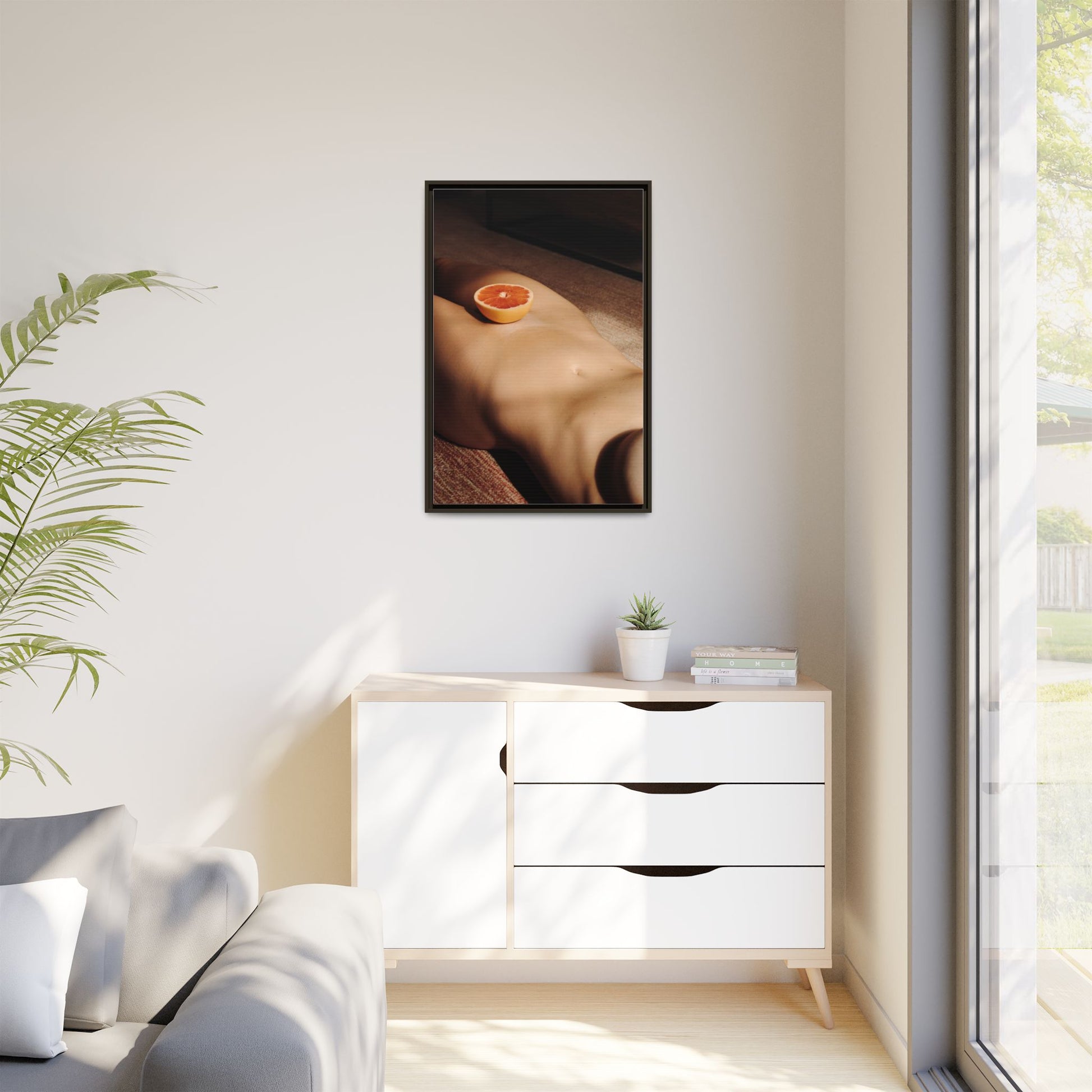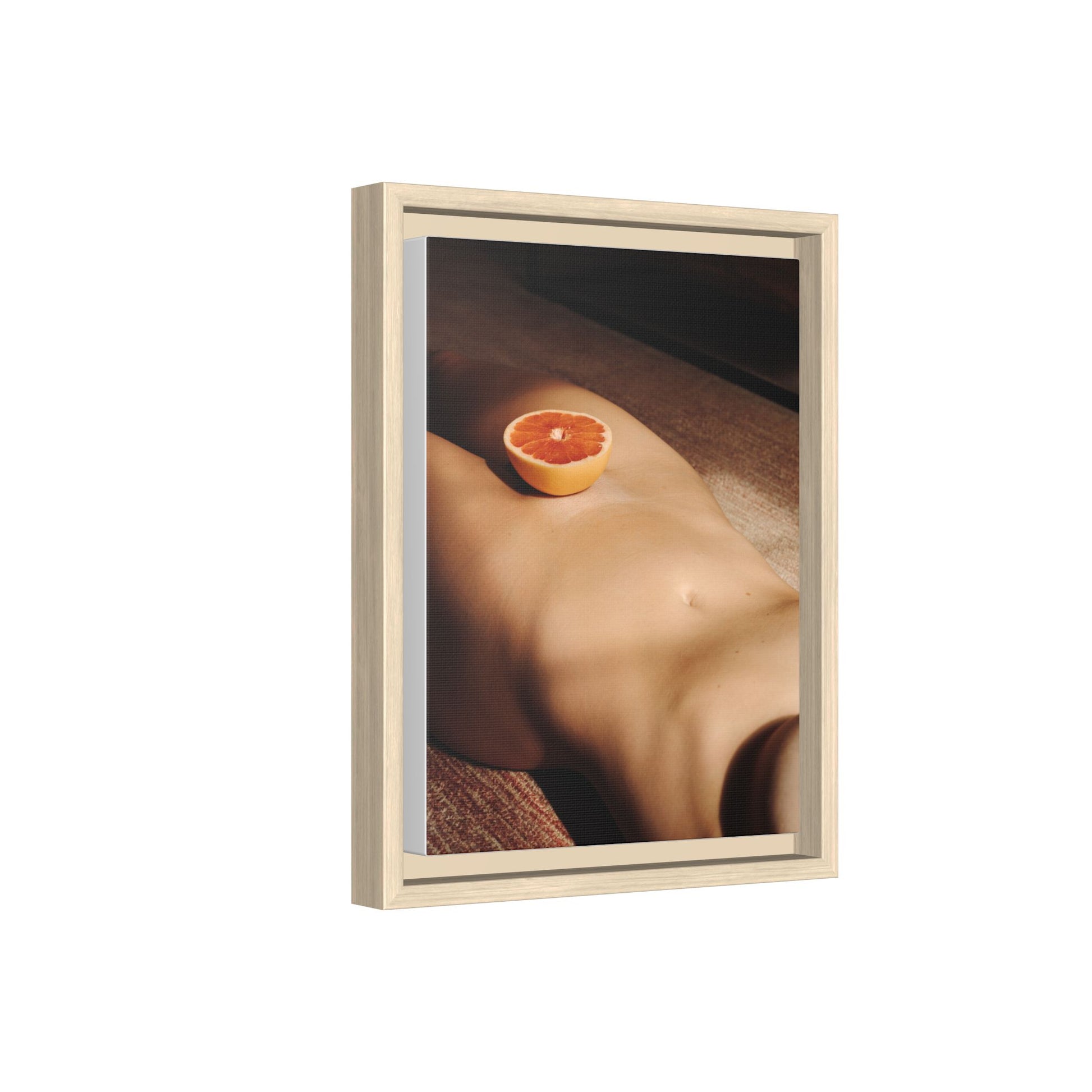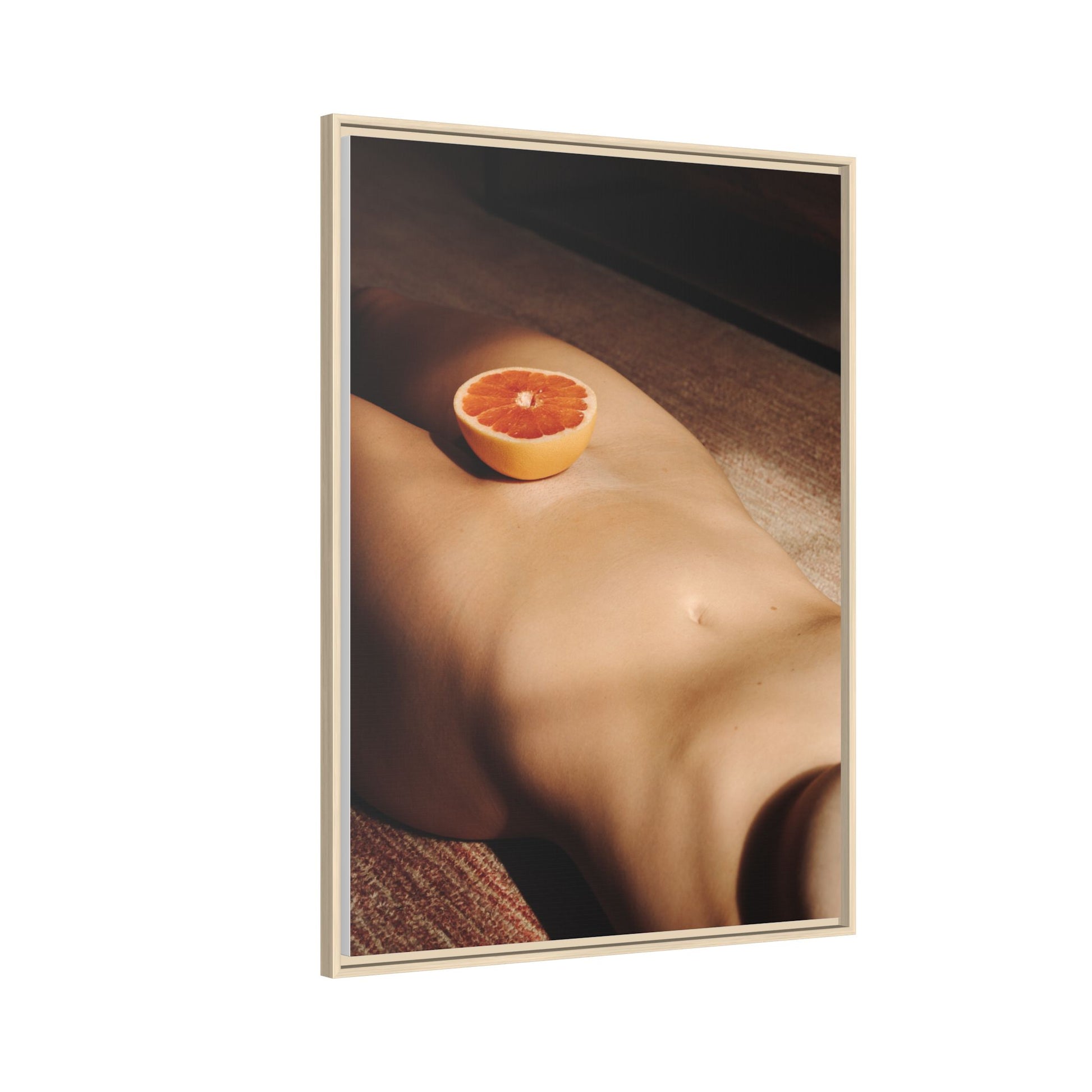 This framed matte canvas brings a warm, intimate still-life into your space — a soft study of skin-tones and a single citrus slice caught in late afternoon light. The matte finish softens glare and deepens the shadows, while the slender pine frame gives the piece a grounded, gallery-like presence. Hang it above a low sideboard, in a sunlit reading nook, or in a bedroom where quiet, tactile moments are welcome. The image invites slow viewing: a hush of warmth, the tang of orange imagined, and an everyday scene turned quietly cinematic.