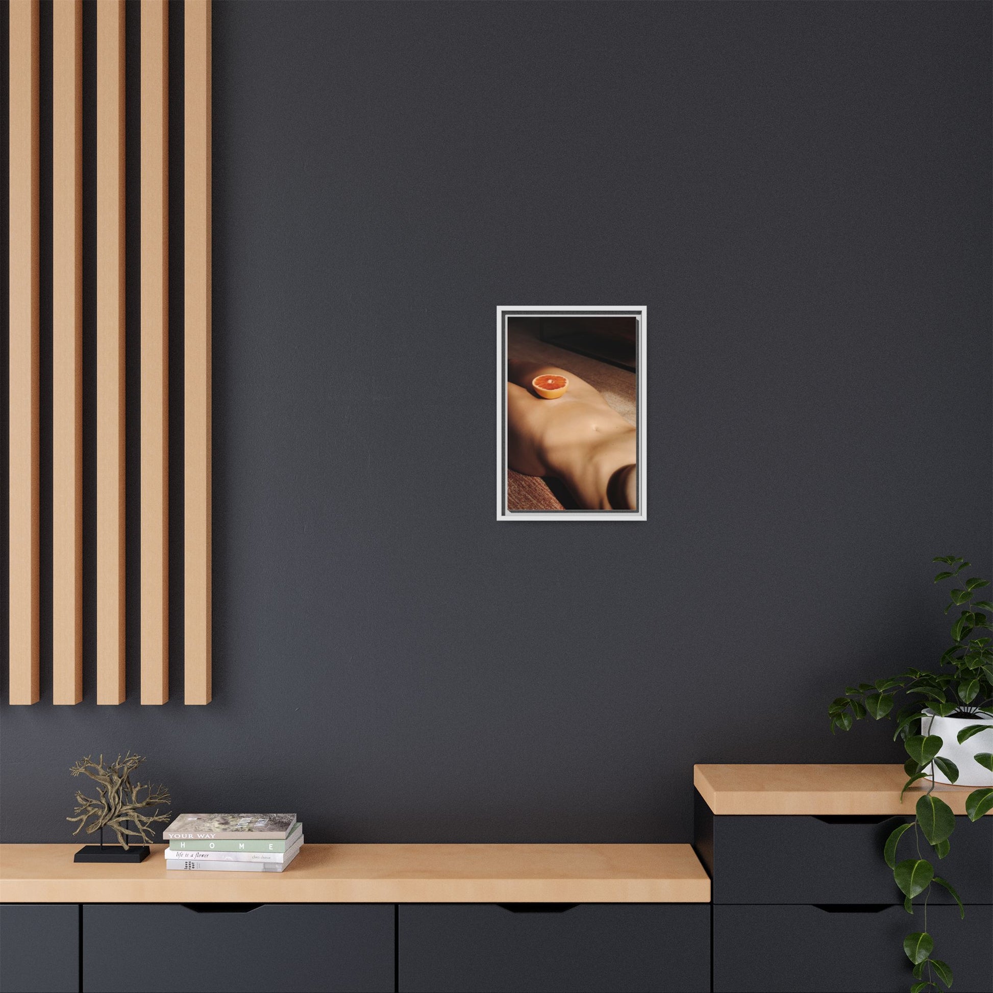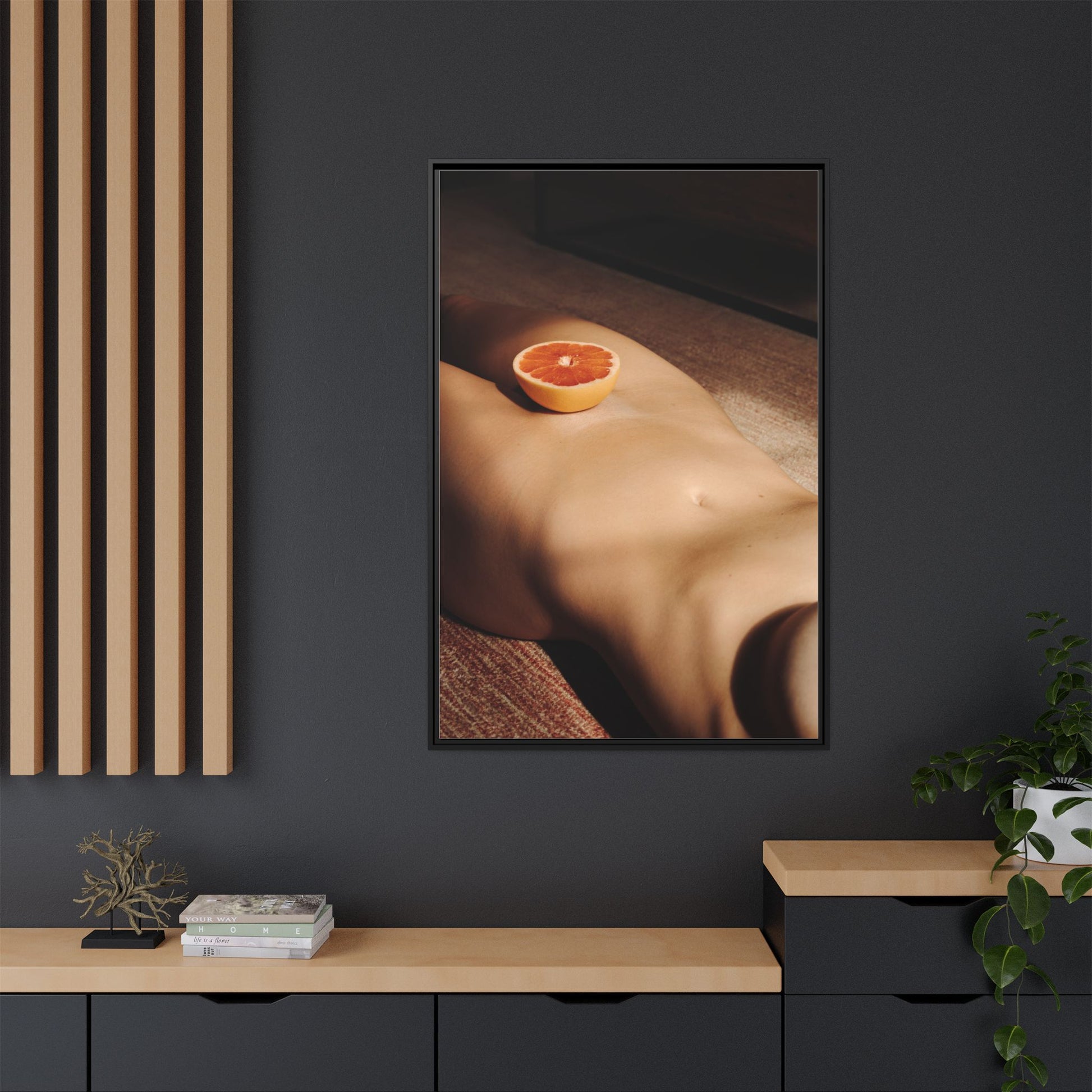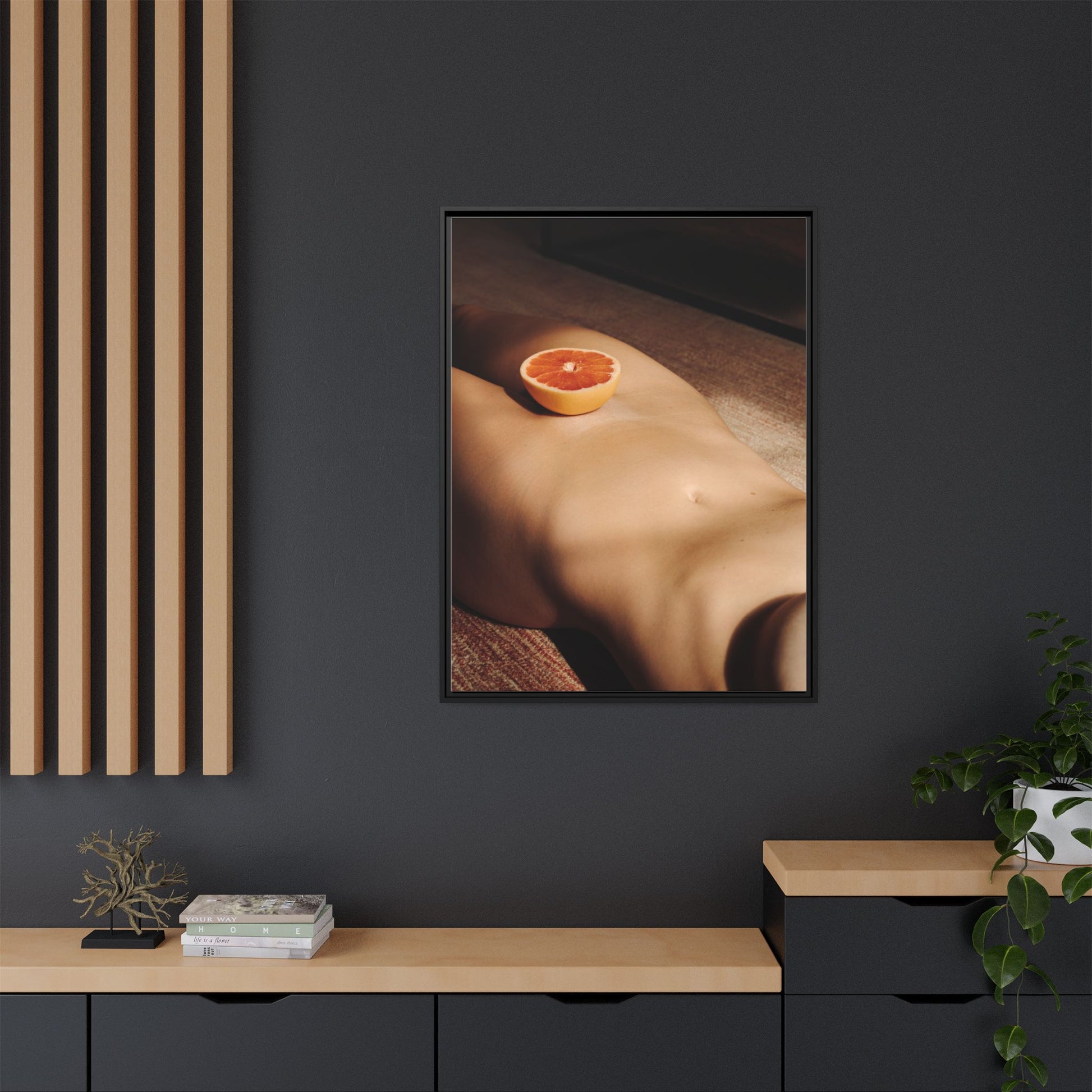 This framed matte canvas brings a warm, intimate still-life into your space — a soft study of skin-tones and a single citrus slice caught in late afternoon light. The matte finish softens glare and deepens the shadows, while the slender pine frame gives the piece a grounded, gallery-like presence. Hang it above a low sideboard, in a sunlit reading nook, or in a bedroom where quiet, tactile moments are welcome. The image invites slow viewing: a hush of warmth, the tang of orange imagined, and an everyday scene turned quietly cinematic.