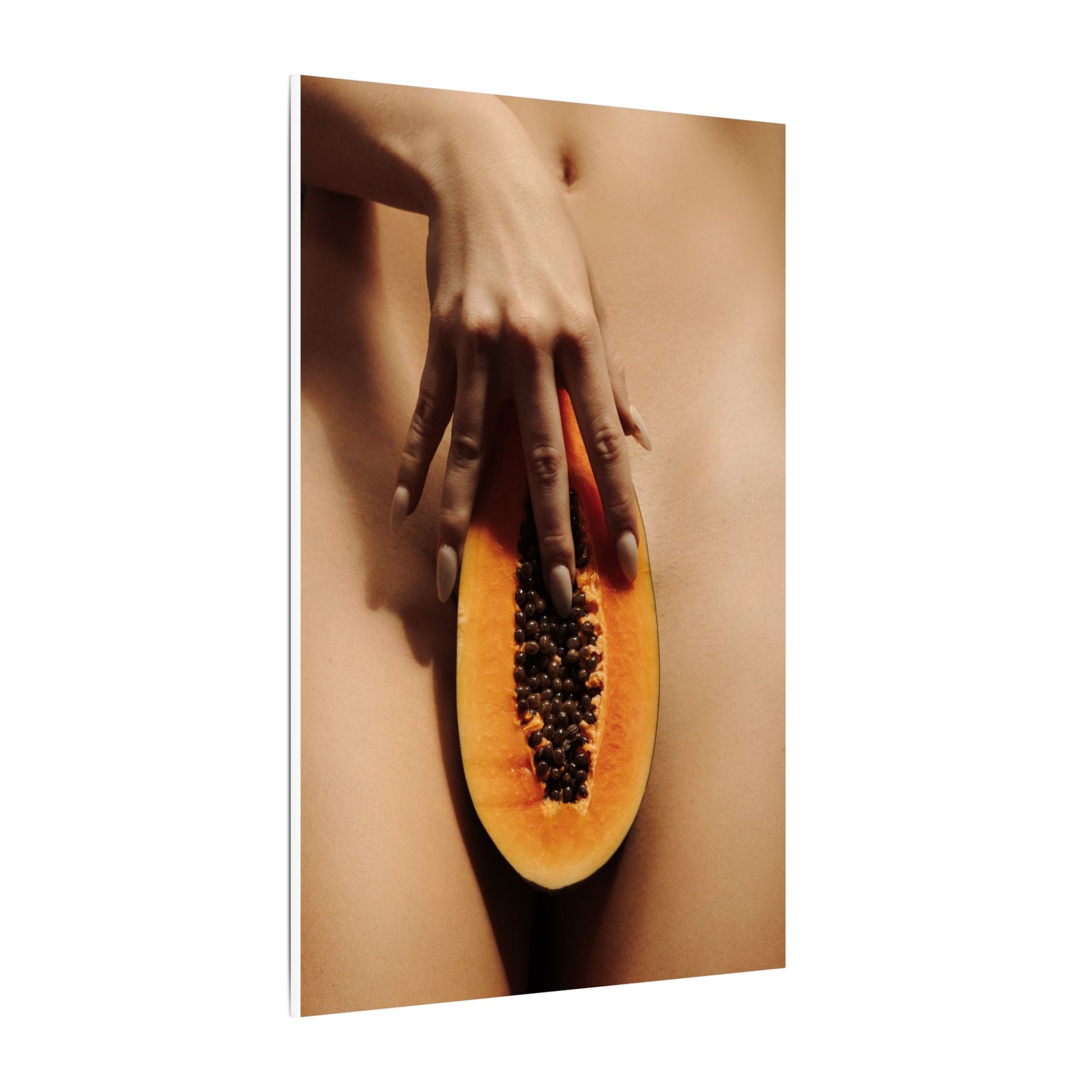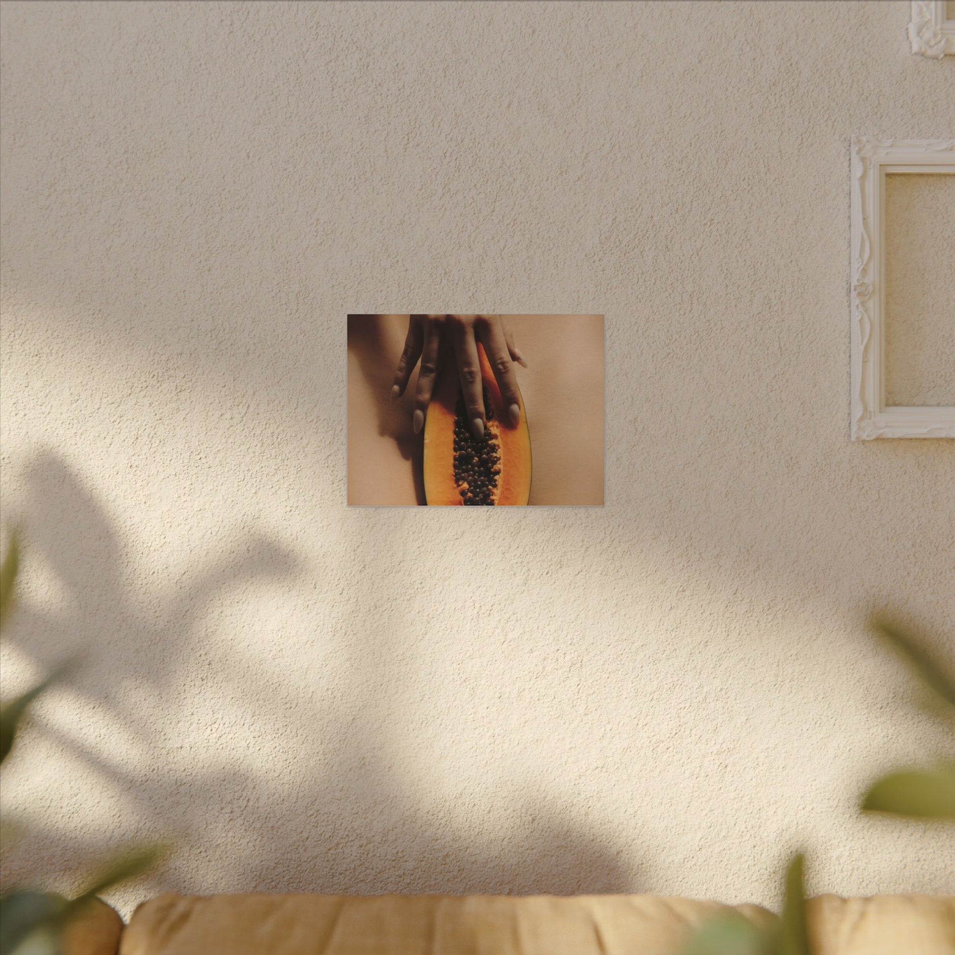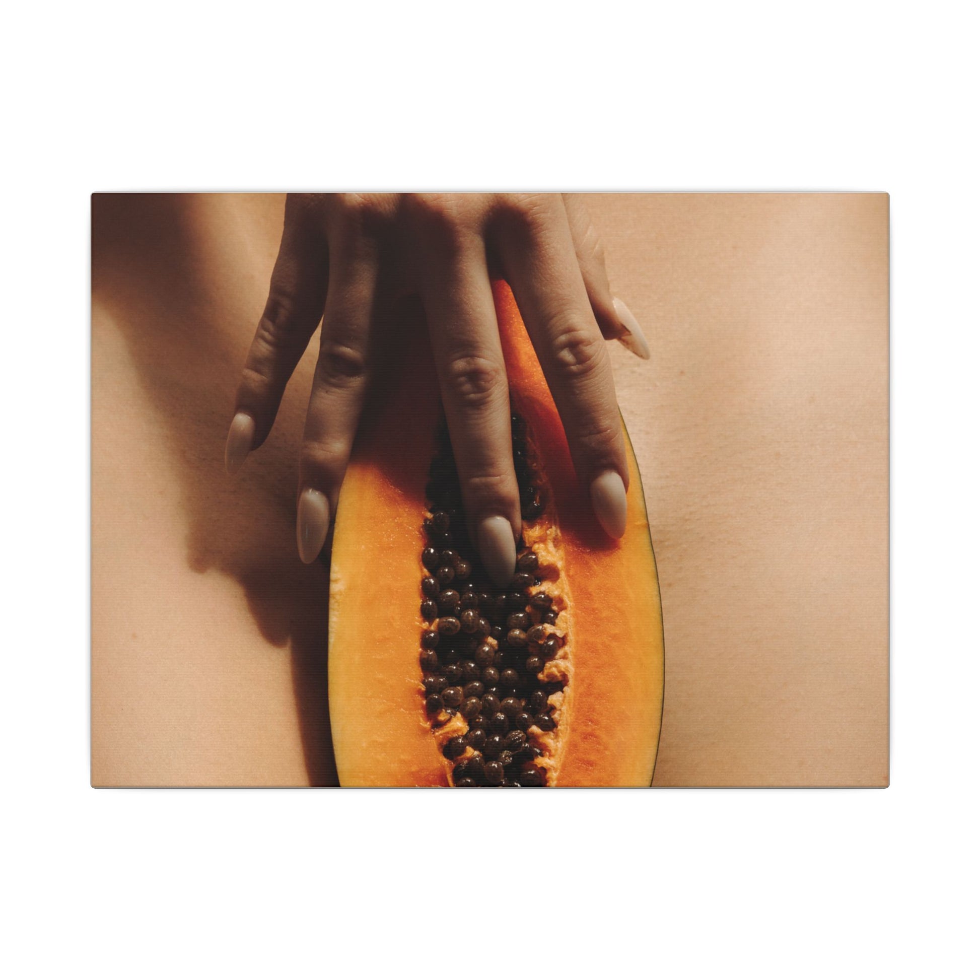 A stretched matte canvas print that brings a warm, intimate still-life into your space. The image — a close, tactile composition of a halved papaya held against skin — reads sensual and quiet, with soft earthy tones and natural texture. Printed with eco-conscious latex inks on a durable cotton/poly canvas and stretched over a finely milled radiata pine frame, the piece has a museum-style depth while keeping a low-reflective, velvety finish. It hangs securely thanks to soft rubber corner dots and comes in multiple sizes to suit a bedside vignette, gallery wall, or cozy living room corner. This canvas fits homes that favor organic imagery and tactile storytelling, adding a subtle, evocative focal point that invites a second look.
